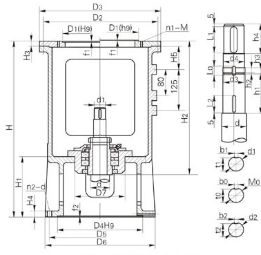 本系列機架是為攪拌傳動裝置(HG21563-95)配套的機架。XD型為單支點機架,減速機出軸用DF型聯(lián)軸器與攪拌軸聯(lián)接,XS型為雙支點機架,減速機出軸用HL型聯(lián)軸器聯(lián)接,兩支點間用DF型聯(lián)軸器聯(lián)接。機架分A型(軸封采用2001、2003、2004、2006型機械密封)或B型(軸封(2002、2005、2007型機械密封或506、516、606、616型填料箱)。機架輸出端接口可與第九部分(二節(jié))所列的安裝底蓋及釜口法蘭聯(lián)接。